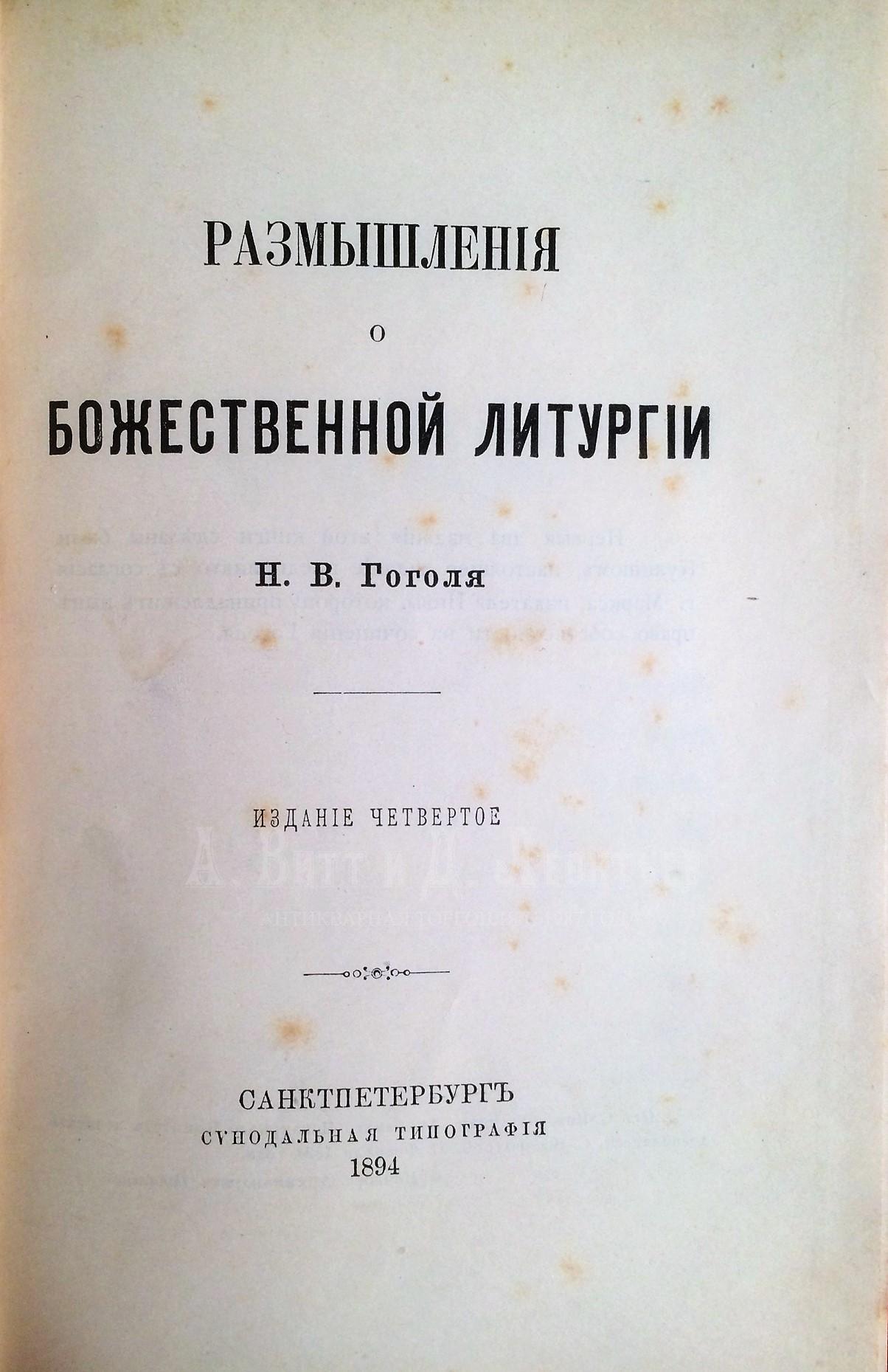 Гоголь Н.В. Размышления о Божественной литургии Н.В. Гоголя. 4-е издание. СПБ, Синодальная типография, 1894 год. Коленкоровый переплет. Отличное состояние. Редкое малоформатное издание.