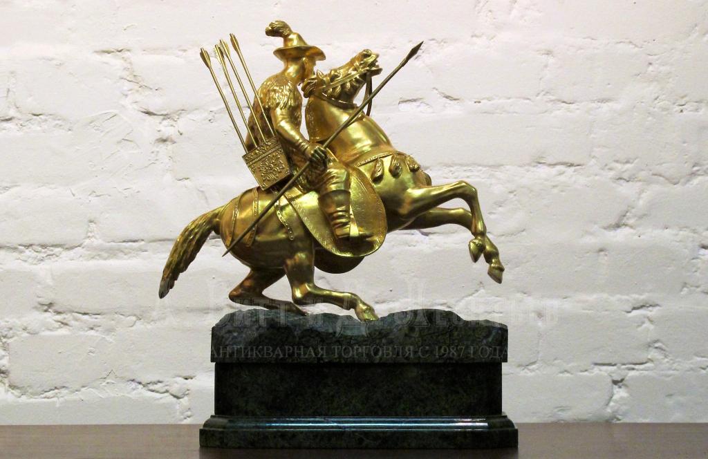 Красивая позолоченная бронзовая скульптура установлена на постамент из зеленого змеевика (серпентина). Изображен обобщенный образ легкого воина-кочевника времен раннего средневековья, имеющий сходство с всадниками армии Золотой Орды. Размеры 42 х 31 х 14 см.