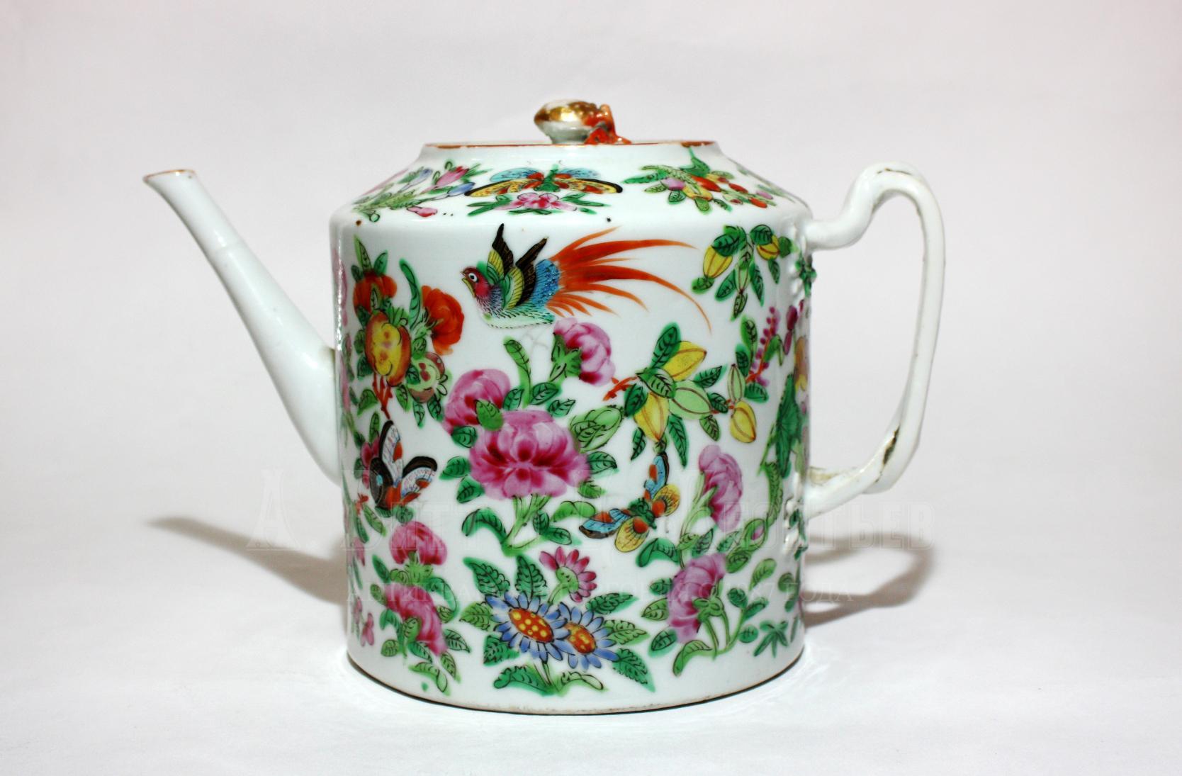 Старинный китайский фарфор. Чайник с изображением цветов, птиц и бабочек изготовлен в Китае для европейского рынка в конце 18 - начале 19 века.