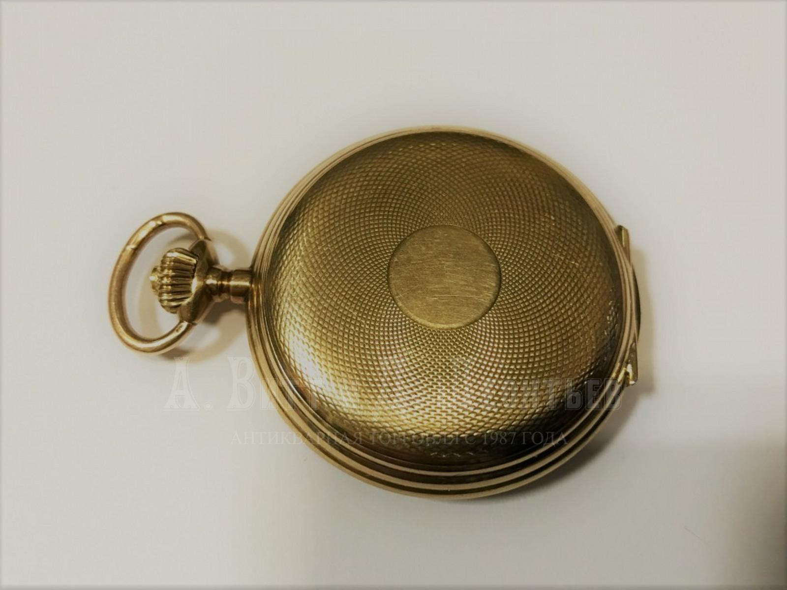 Карманные антикварные часы для русского рынка. Корпус из золота 56/585 пробы украшен ювелирной гильошированной сеткой. Механизм Qualite Monard фирмы XX SIECLE, "прямая линия", анкерный, ремонтуарный, на 22 камнях, имеет 3 шатона, №15078. Механизм предохраняет пыльник со стеклом. Стрелки вензельного типа. Задняя крышка украшена гравированной надписью с описанием механизма. Циферблат белый эмалевый, с римскими цифрами. Прекрасный антикварный подарок или пополнение коллекции старинных часов.