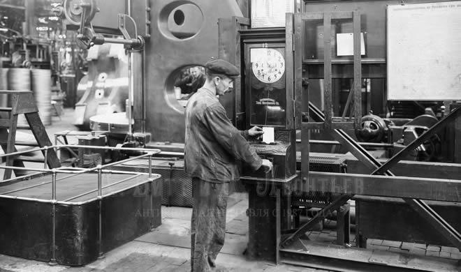Часы, показывающие время, соединены с механизмом, оборудованный наборным штампом для отображения текущего времени на пропуске трудящегося, по принципу штемпеля контролера. Штамп приводится в движение механическим ручным приводом. Часы в деревяном корпусе из дуба, размер 110 на 60 см. В рабочем состоянии. Часы подобного типа использовались на проходных фабрик и заводов СССР для фиксации выхода рабочего на смену и его ухода. Вывезены после войны из Германии во время окупации и русифицированы. Наглядный символ эксплуатации рабочих при капитализме. И социализме, впрочем, тоже. Публикуем интересное фото бытования таких часов с выставки "Gesichter der Arbeit" ("Лица труда") Photographs of East Berlin Industrial Plants by Günter Krawutschke, 1971-1986", SDTB, Исторический архив, и фото здания завода Бурк в Швенингене, теперь это часовой музей. Цена: 40000 руб. |
