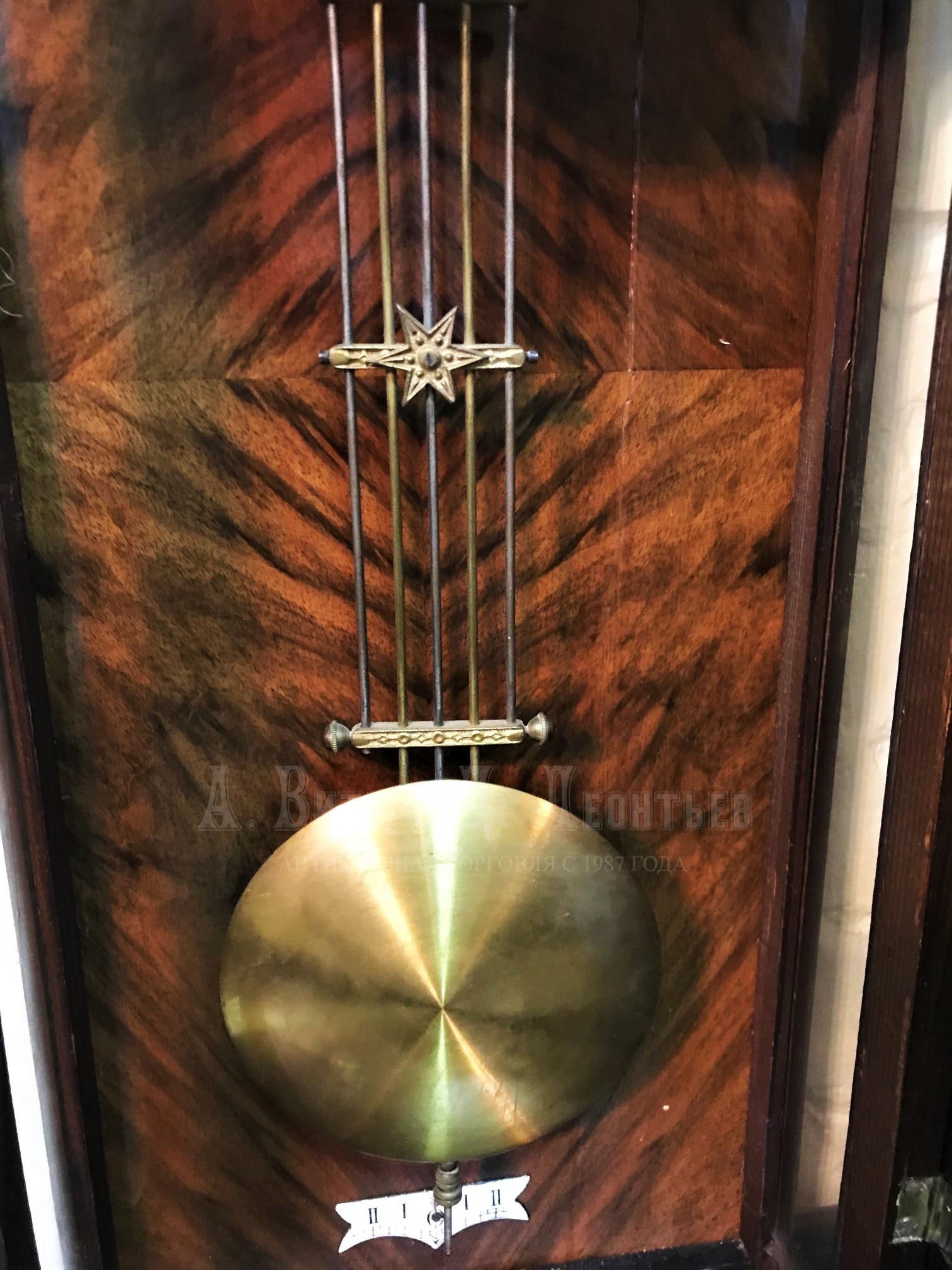 Настенные антикварные часы в ореховом корпусе. Эмалевый циферблат с римскими цифрами, получасовой бой, биметаллический маятник, хороший ход, получасовой и часовой бой. Завод ключем с циферблата.Маркировка на цичерблате и задней платине механизма. Торговый дом Павла Буре не производил сам механизмы для настенных часов, они закупались в Германии, в частности, у фирмы Ленцкирх. Эти механизмы считались очень надежными, было произведено и продано в разные страны около 2.000.000 механизмов, и они получили название "миллионник".