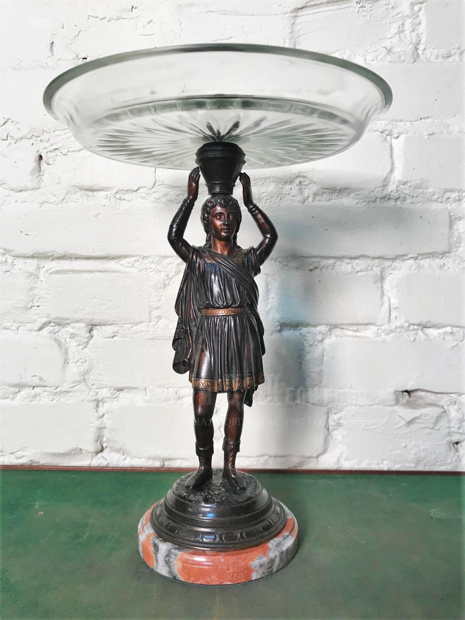 Приятная антикварная настольная ваза для фруктов, стоян очень качественно отлит из чугуна, патинированного в два цвета. База из розового с серо-белыми прожилками мрамора. Тарель стеклянная. Возможны другие варианты тарели - хрусталь или другое стекло.