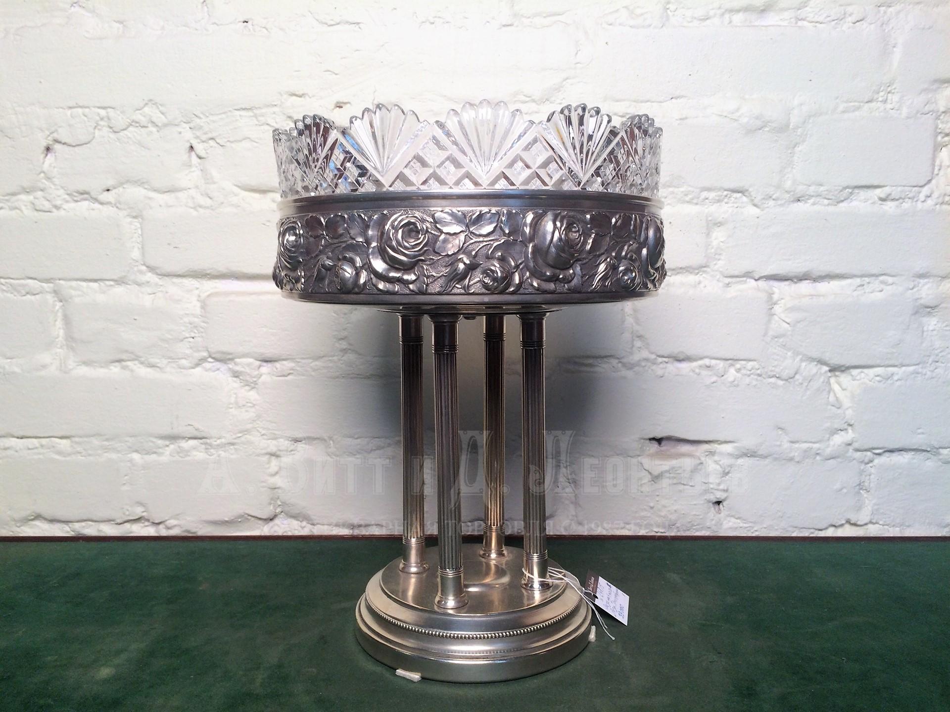 Антикварная ваза с рельефными розами по бордюру, металл (латунь), посеребрение. Франция (?), начало XX века, стиль Ар нуво - Ар деко. Хрустальная вставка выполнена на знаменитой фабрике Валь Сен Ламбер. Хорошая сохранность.