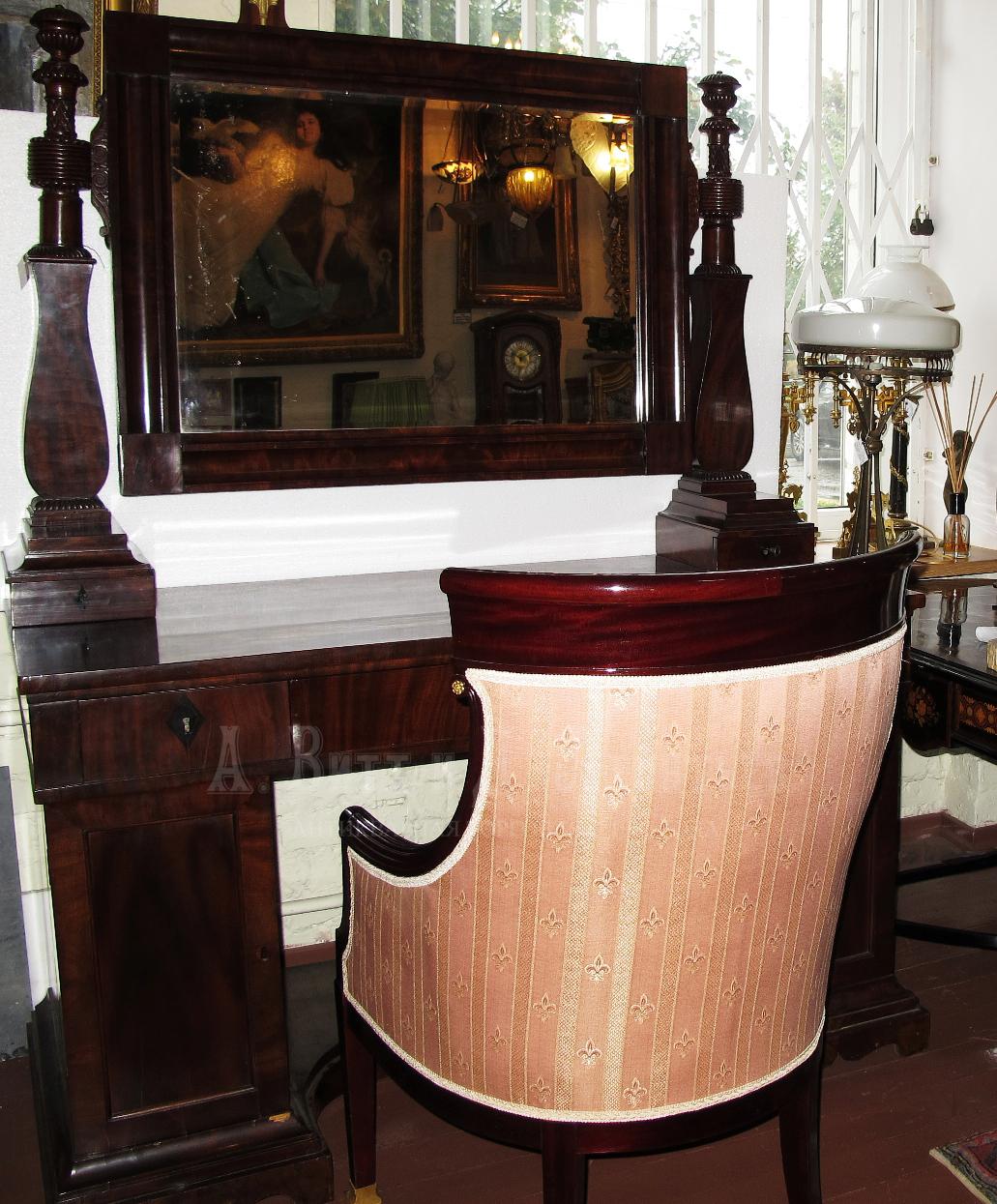 Двухтумбовый туалетный стол с размещенным на столешнице между двумя резными стойками зеркалом - псише. Красное дерево с "пламенем". Классическая стилистика, толщина использованного шпона, конструктивные особенности позволяют датировать предмет 1830-1840 годами. Общая высота 185 см., ширина столешницы 145 см., глубина 66 см. Приличное состояние. Незначительные потертости и сколы. Предпродажная реставрация может быть выполнена нашими мастерами.