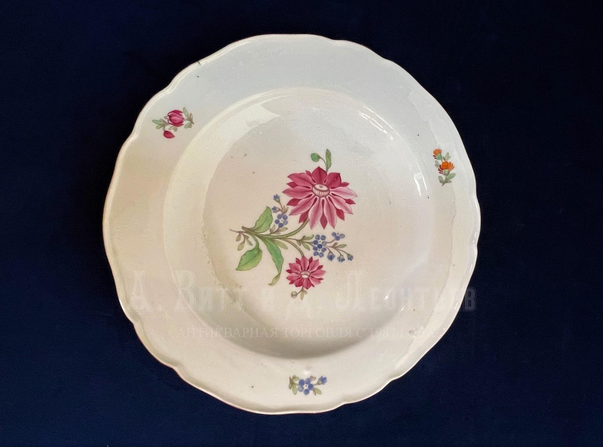 Антикварная фарфоровая тарелка. Украшена по моде, господствовавшей во второй половине XVIII века - крупный цветок или букет в центре и три меньших на полях. Вероятно, при обжиге на гразури были дефекты и тарелка подвергалась фрагментарной доглазуровке в этих местах. Это свидетельствует о том, что тарелка очень ранняя, возможно 1760-х - 1770-х годов.