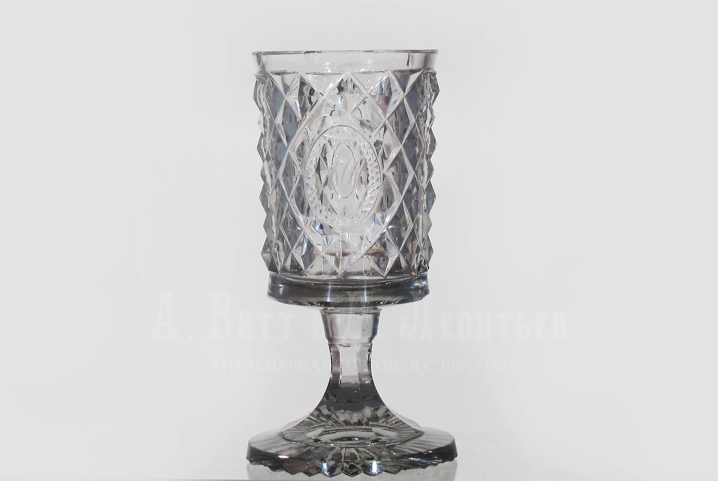 Бокал цилиндрической формы с "алмазной" или "ананасной" гранью в виде островерхих четырехгранных пирамидок. К медальонах гравированные монограммы "АШ" и "ВШ". Высота 12,5 см. Незначительные сколы по верхней кромке.
