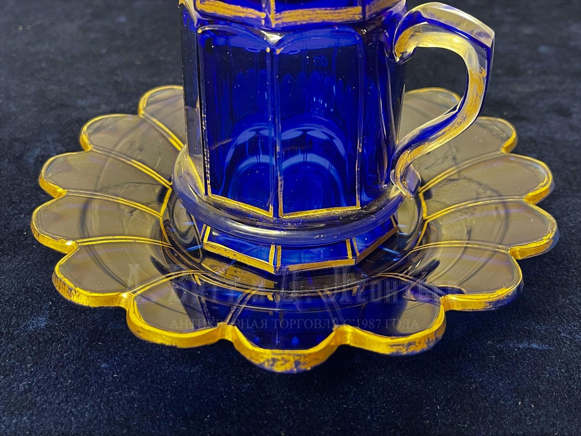 Синее (кобальтовое) стекло, резьба, шлифовка, полировка, золочение. Высота с крышкой 14.5, диаметр блюдца 16 см. Без сколов и трещин, небольшие потертости позолоты. Автором проекта Готического сервиза был Иванов Иван Алексеевич (1779-1848), архитектор; в 1789-1798 годы обучался в Императорской Академии художеств. В 1798 году за архитектурную композицию получил малую серебряную медаль, аттестат I-й степени и звание художника. В 1806-1815 годы служил в Кабинете Его Императорского Величества при художнике Ф. Гаттенбергере «для рисования разных изображений и скопирования рисунков». С 1806 года проектировал произведения декоративно-прикладного искусства. В 1815-1848 годы - инвентор (художественный руководитель) на Императорском стеклянном заводе; с 1830 года - академик. Хороший антикварный подарок или пополнение коллекции императорского русского стекла. Цена: 79000 руб. |